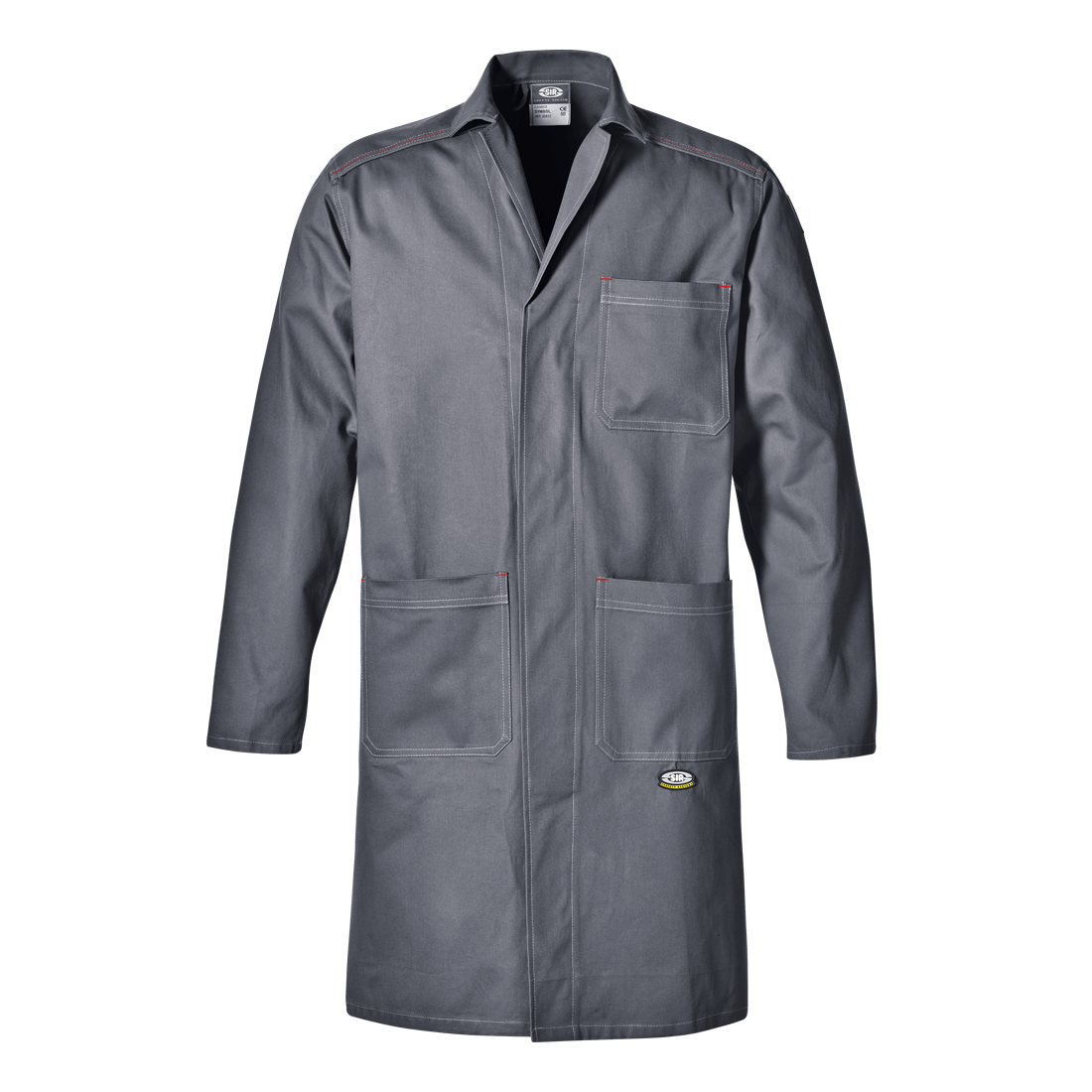 Coat made of 100% Massaua sanforized cotton 2/1, weight 280 g/m2. Knee-length coat, four button concealed closure, two side pockets, front pocket and triple seams in contrasting colour on the shoulders.
