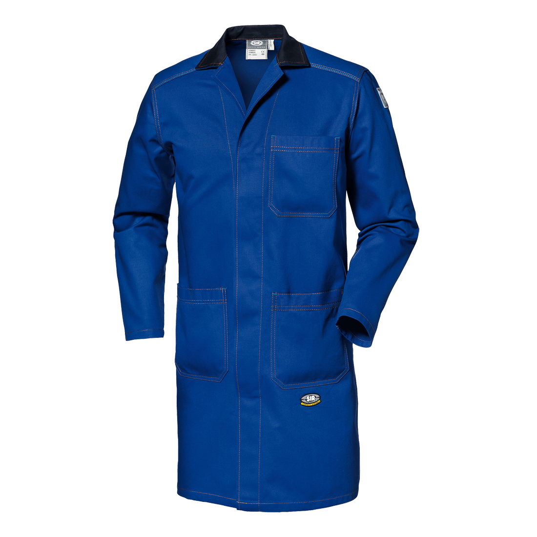 Coat made of 100% Massaua sanforized cotton 2/1, weight 280 g/m2. Knee-length coat with collar in contrasting colour, four button concealed closure, triple seams on the shoulders, two side pockets and chest pocket.