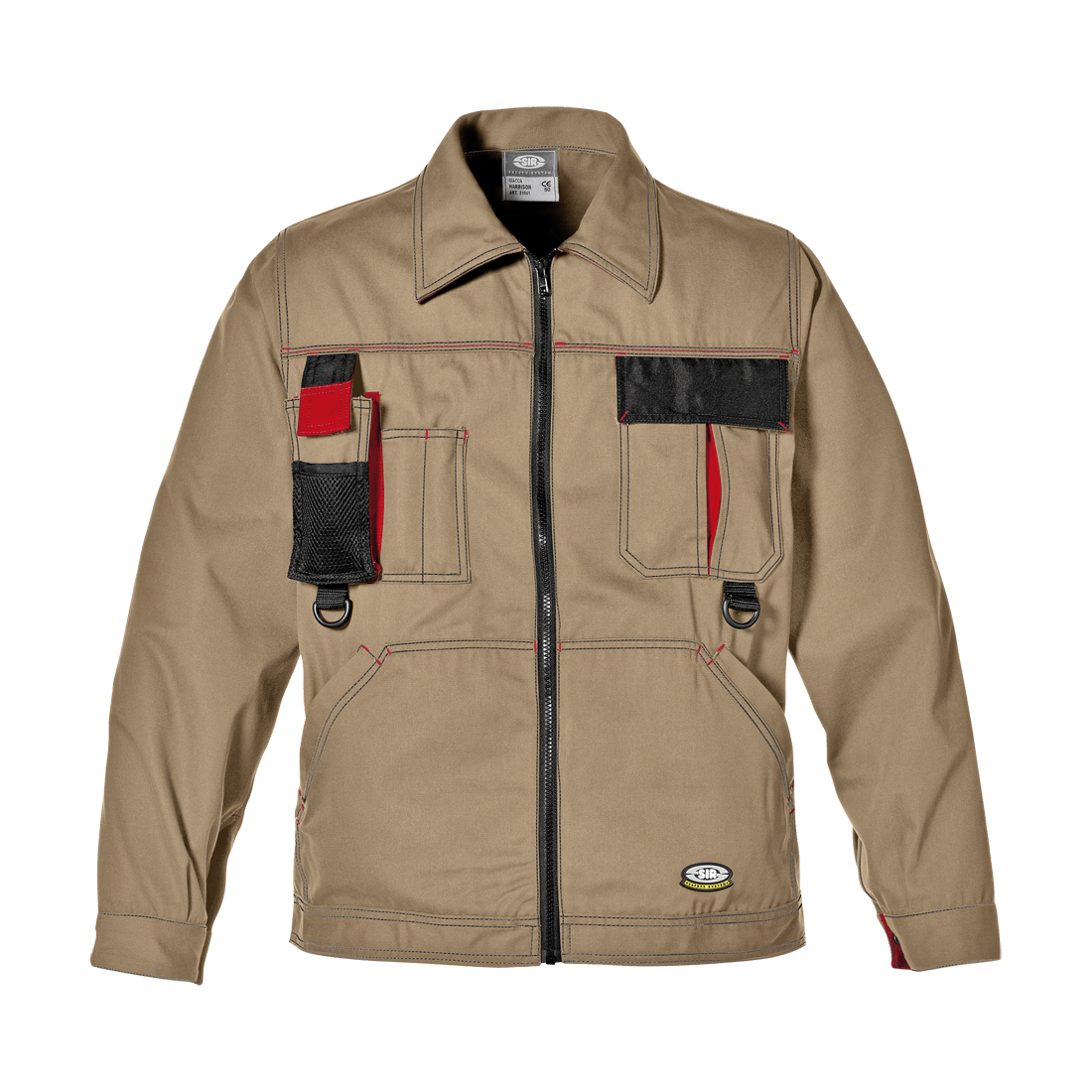 Multi-pocket jacket made of 65% polyester and 35% broken twill cotton with double stitched seams for high resistance, weight 300 gr/m2. It features a high tenacity zipper closure, muff pockets, multi-functional chest pocket with pen holder and phone pocket with Velcro closure on the right side, cargo pocket on the left side, D-rings under the chest pockets, cuffs with snap button, wear-and-tear reinforcements, red details and black Cordura inserts.