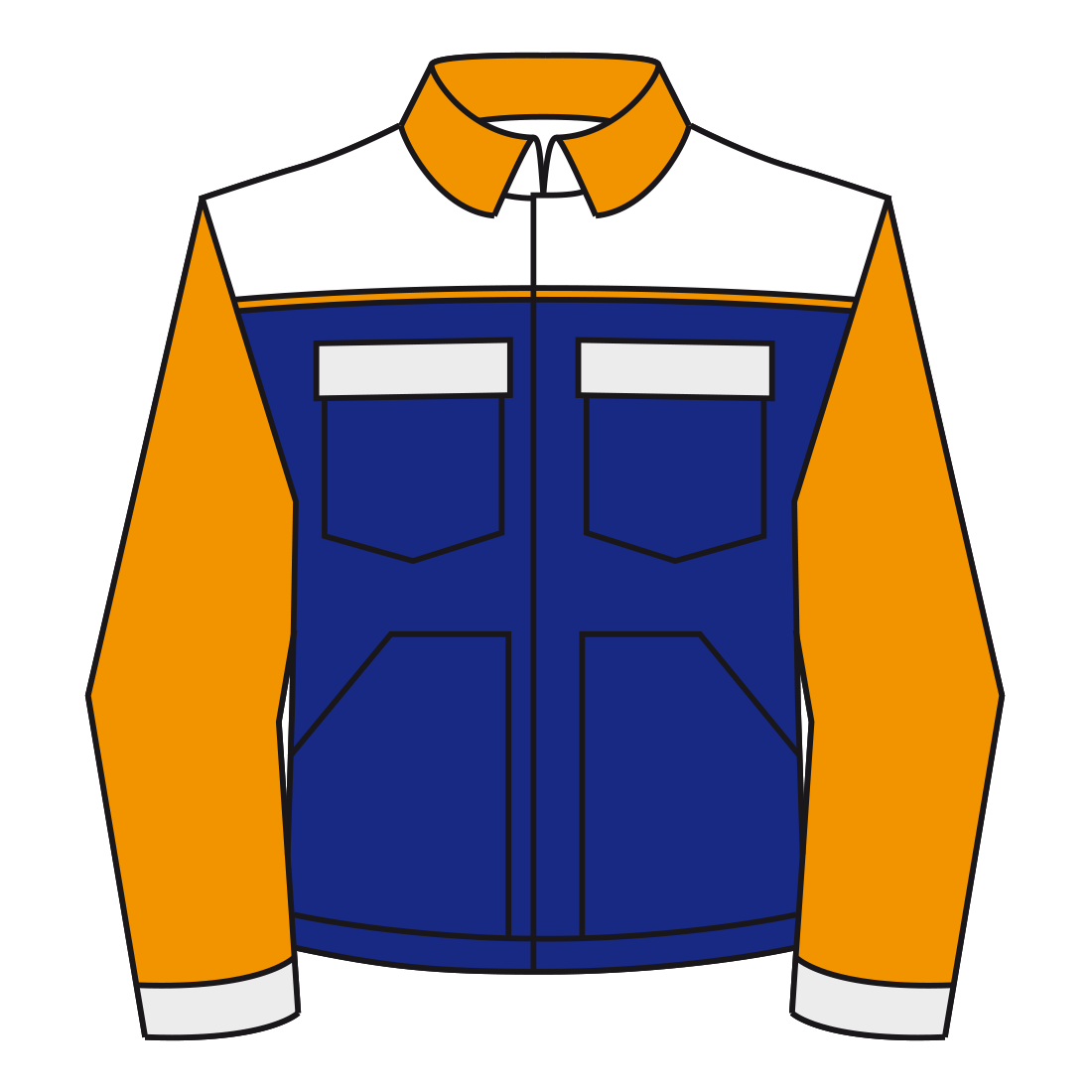 Short jacket made in Evolution fabric, 65% polyester and 35% cotton, weight 240 gr / m2, concealed six button closure, two chest pockets with flap and button closure, two muff pockets and buttoned cuffs; Jointed double seams. Tricolor model with piping on ches.