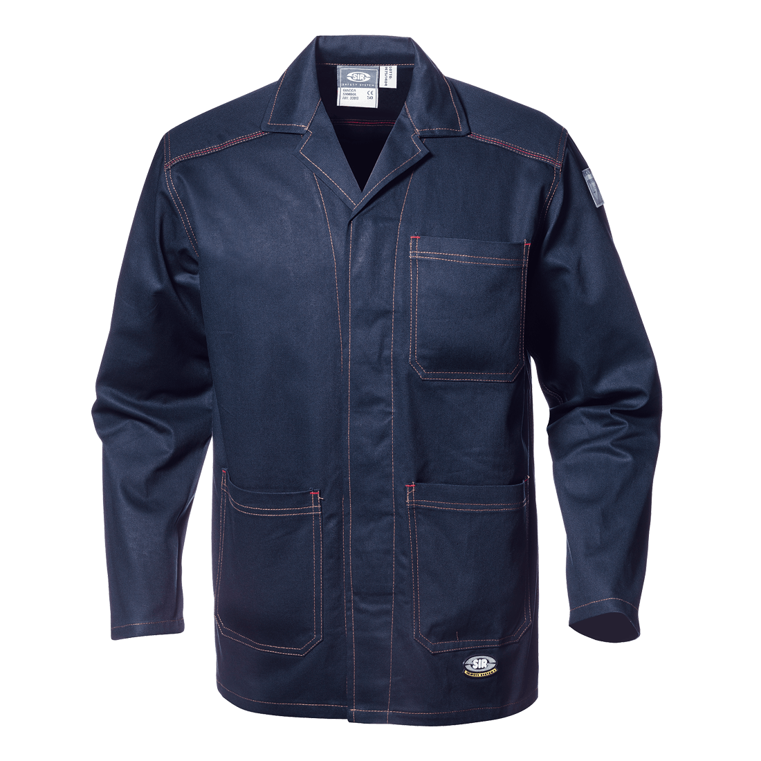 Jacket made of 100% Massaua sanforized cotton 2/1, weight 280 g/m2. Concealed closure with four buttons, two side pockets and a chest pocket, triple stitched seams on the shoulders.