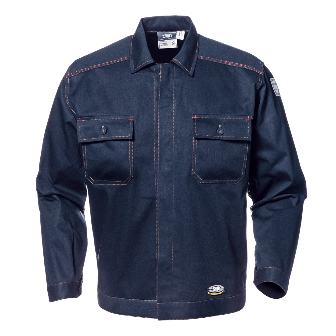 Short jacket made of 100% Massaua sanforized cotton 2/1, weight 280 g/m2. Concealed closure with four buttons, two side pockets and a chest pocket, triple stitched seams on the shoulders.