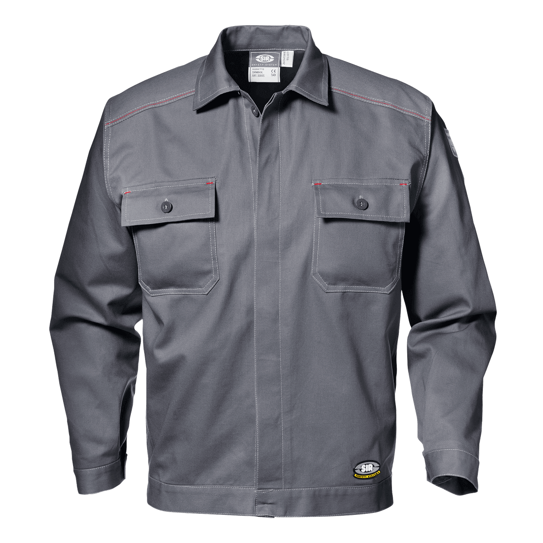Short jacket made of 100% Massaua sanforized cotton 2/1, weight 280 g/m2. Shirt collar, five button concealed closure, pockets with flap and button closure, buttoned cuffs and triple seams on the shoulders.