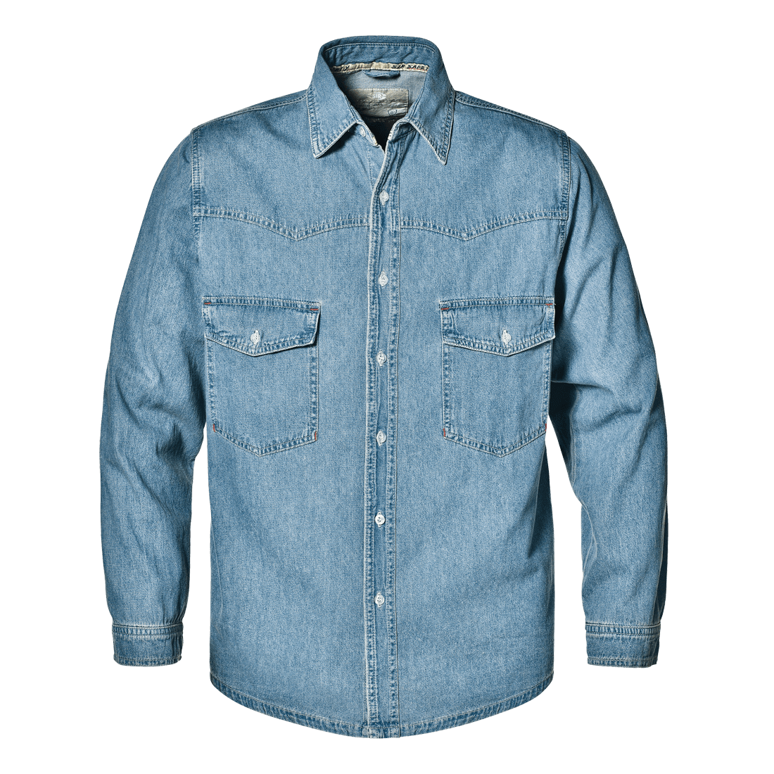 Denim shirt made of 100% cotton, 195 g/m2, long-sleeved with buttoned cuffs, two chest pockets with flap and button, stone-washed and denim colour.