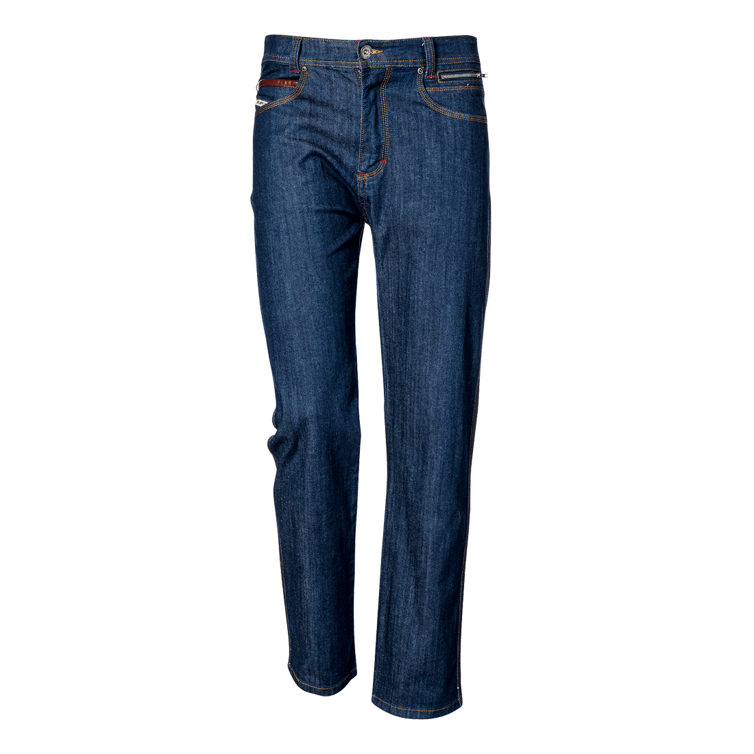 Jeans made of denim fabric 350 g/m2, 98% cotton and 2% elastic spandex; fly with zip and tack button, two pockets, one with coin pocket and one with zip, two back pockets with metal reinforcements over the runners, front and rear pocket with eco-friendly leather hem. Triple stitched seams.