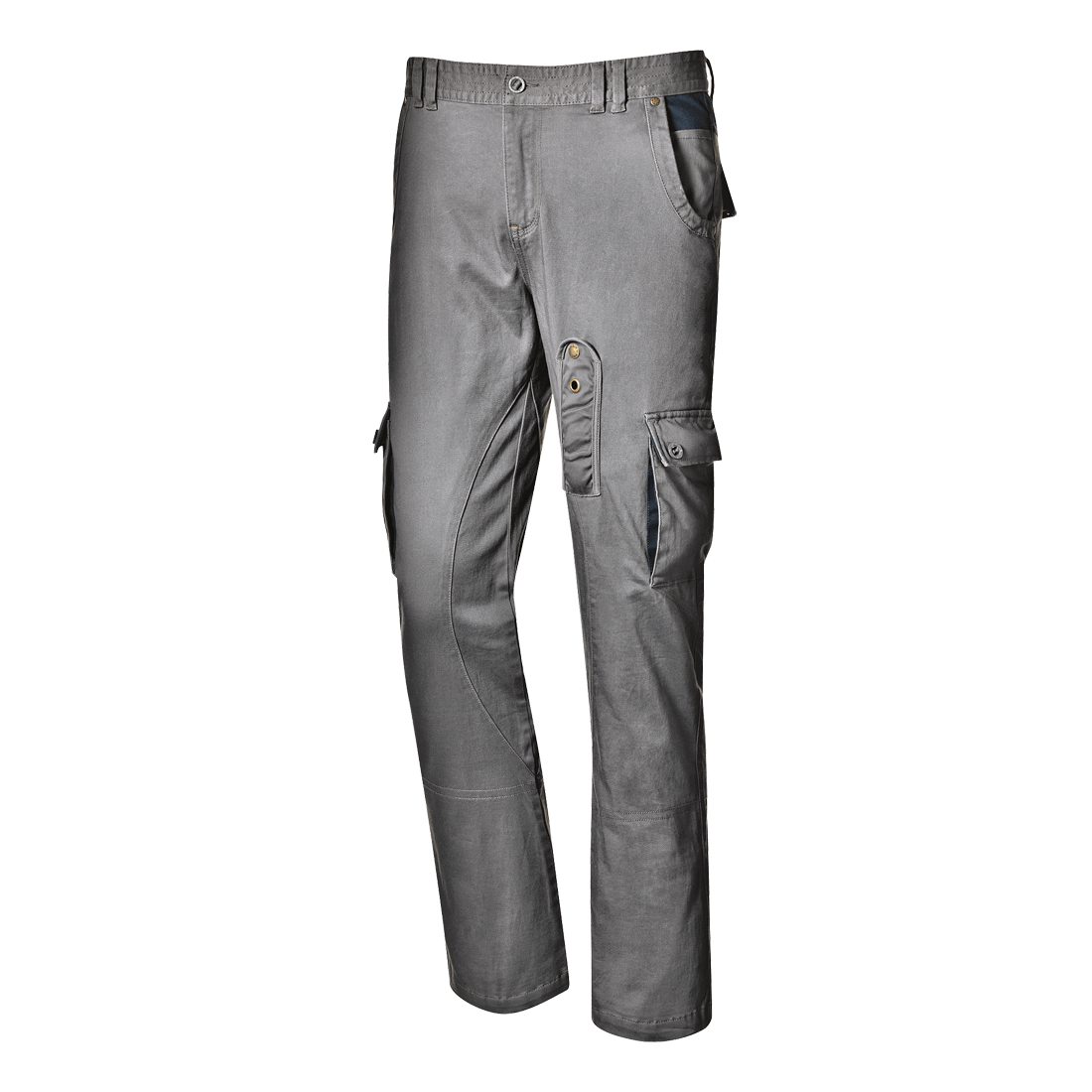 Trousers made of 98% cotton twill, 2% spandex, weight 260 g/m2, stretch; fly with zip and button, two welt pockets, coin-pocket on the right, back pockets with flap and button, three-dimensional side pockets with flap and button, pen holder on the left leg with snap button; inserts in contrasting colour.