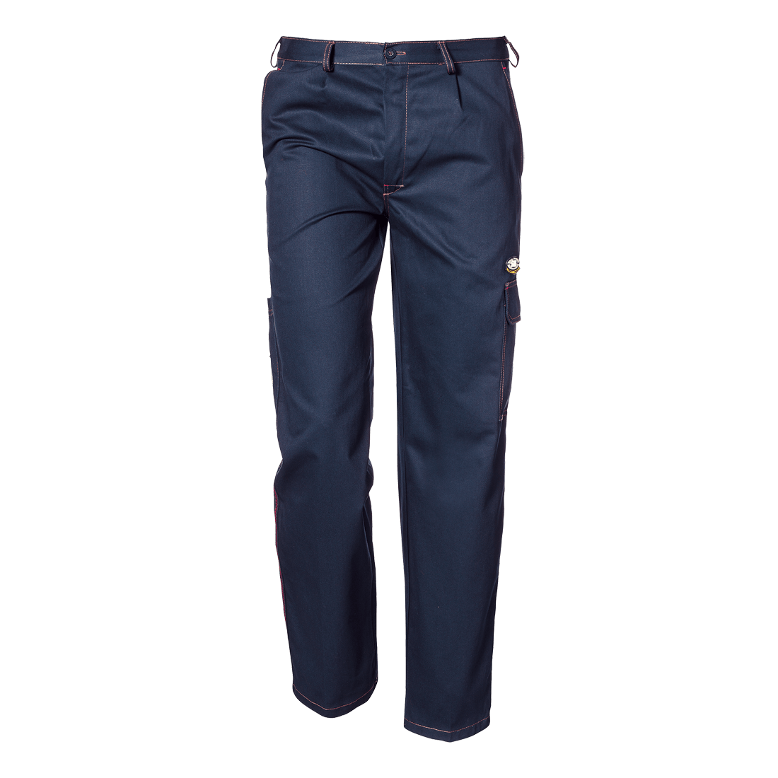 Trousers made of 100% Massaua sanforized cotton 2/1, weight 280 g/m2. Trousers with triple stitched seams on the outer side of the leg, fly with zip and button, two welt pockets and elastic waistband on the back, belt loops, ruler pocket on the right leg and a utility pocket with pen holder on the left side, one rear pocket with button closure.