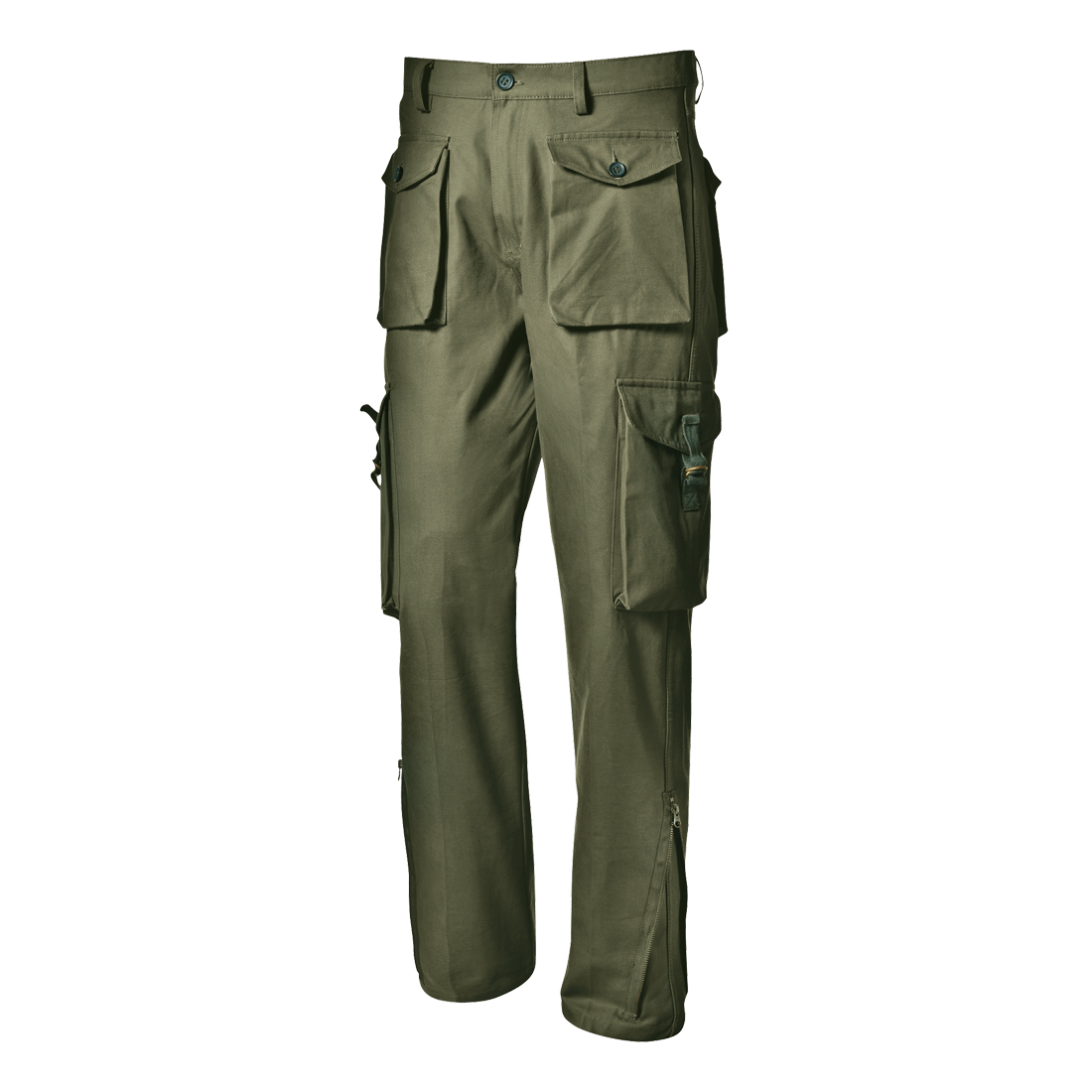 Trousers in100% heavy broken twill cotton, 320 g/m2, jointed double seams, fly with zip and button, three-dimensional front pockets with flap and button, lateral pockets with flap and adjustable buckle closure, rear adjustable waistband, D-ring, zipper closure to adjust the bottom width and back pockets with flap and button.