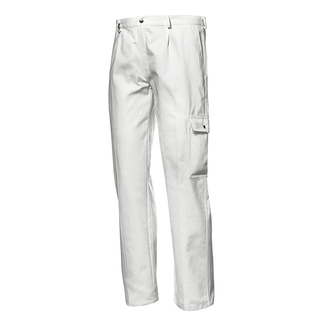 Trousers made of 100% Massaua sanforized cotton, weight 260 g/m2. Fly with zip and button, belt loops, two welt pockets and rear pocket with metal button closure, utility pocket on the left with flap and snap button closure detectable by metal detector; jointed double stitched seams.