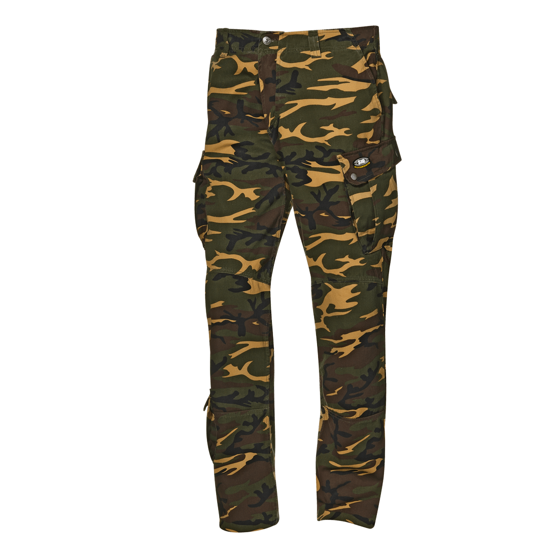 Made of 100% cotton, 270 g/m2, fly with zip and button, two welt pockets, coin-pocket, rear pockets with flap and snap button closure, side utility pockets with flap and button closure, patch pocket with flap and snap button on the right leg.