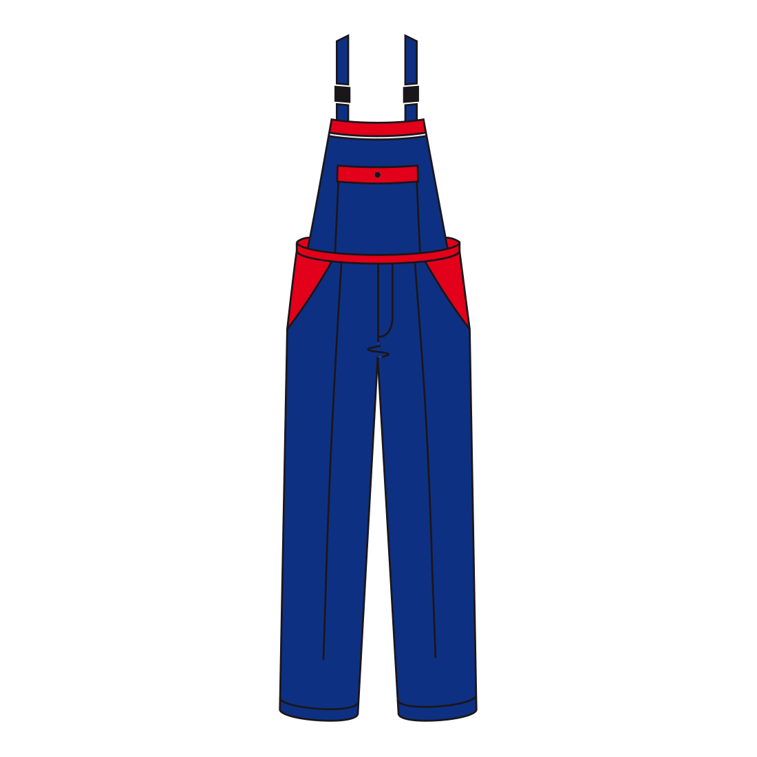 Bib-trousers made in Evolution fabric, 65% polyester and 35% cotton, weight 240 g/m2, adjustable elastic shoulder straps with quick-fastening buckles, bib pocket with flap and button closure, side pockets, back pocket with button closure, piping, rear-bib, back elastic waistband and side slits with button. Jointed double seams. Bicolor model.