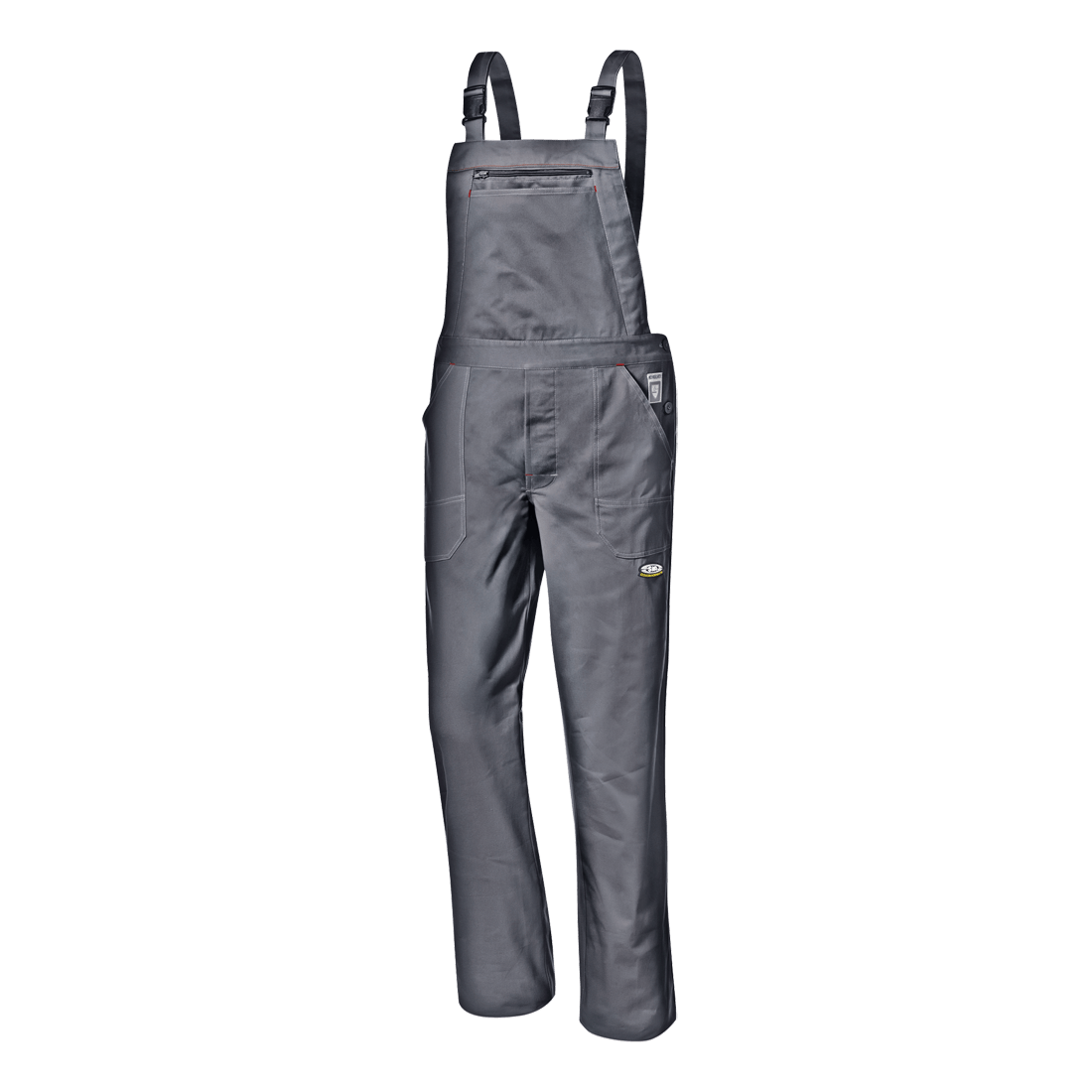 Bib-trousers made of 100% Massaua sanforized cotton 2/1, weight 280 g/m2. Bib-trousers with reinforced front pockets, double bib pocket, elastic shoulder straps with quick-fastening buckles, rear-bib, side slits with buttons and fly with zip, elastic waistband, back pocket and right ruler pocket. Triple seams on the outer leg and bib pocket.
