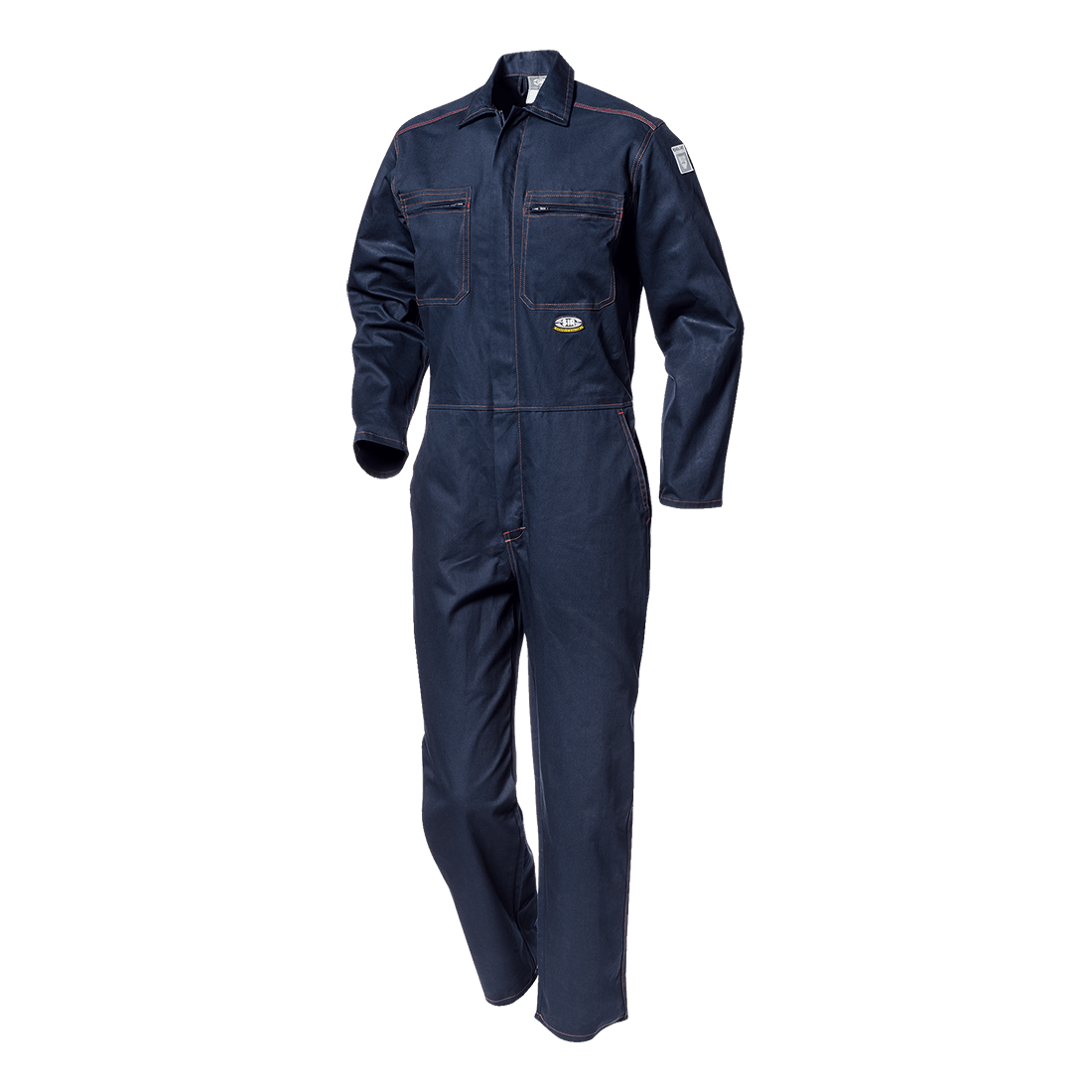 Coverall made of 100% Massaua sanforized cotton 2/1, weight 280 g/m2. Shirt collar, reinforced shoulders with triple stitched seams, elastic waistband on the back, concealed two-way zipper closure, two side pockets, right ruler pocket, back pocket, two small chest pockets with zip closure.