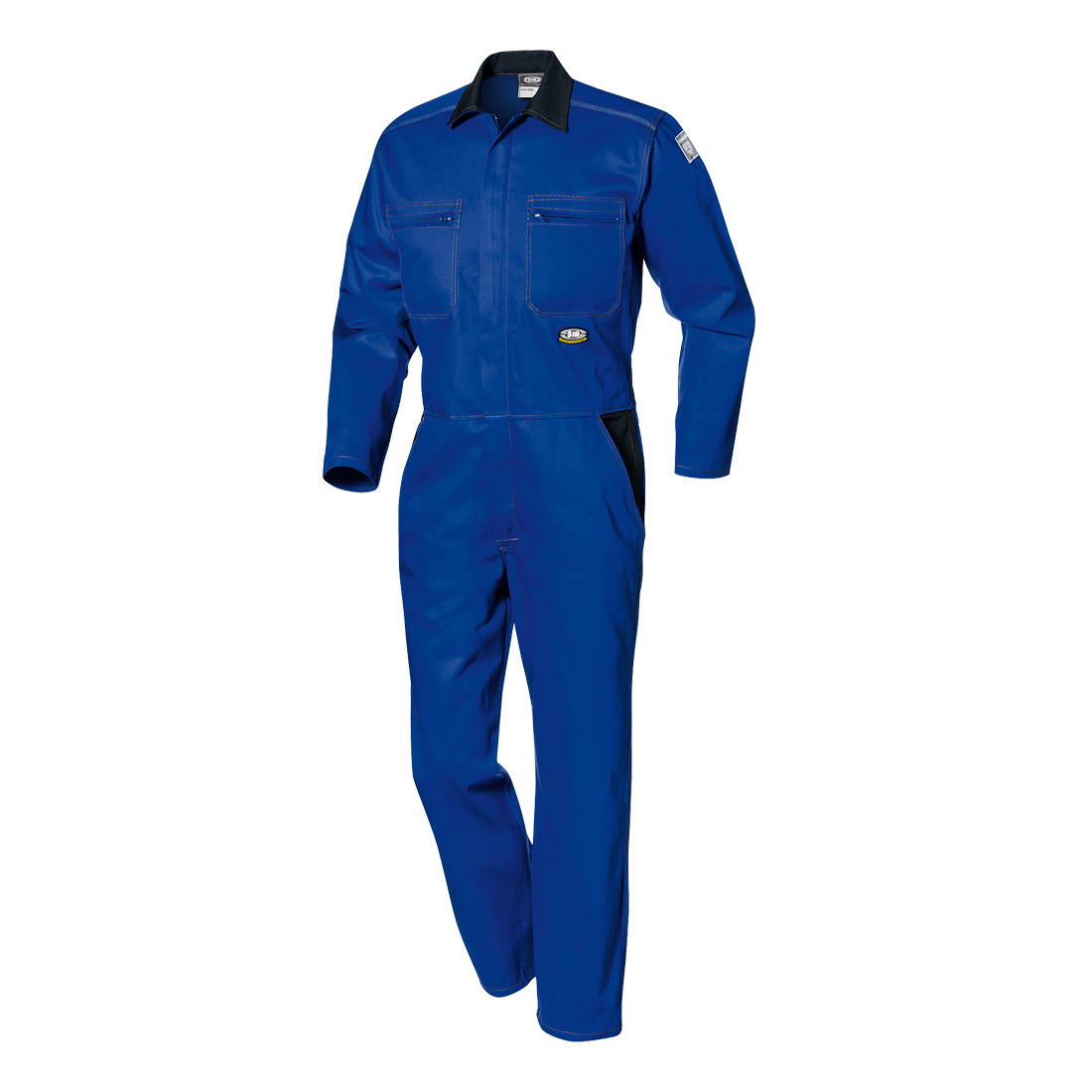 Coverall made of 100% Massaua sanforized cotton 2/1, weight 280 g/m2. Shirt collar, concealed two-way zipper closure, two welt pockets, two chest pockets with zip, reinforced shoulders with triple seams, right ruler pocket, back pocket and elastic waistband. Collar and inserts in contrasting colour.