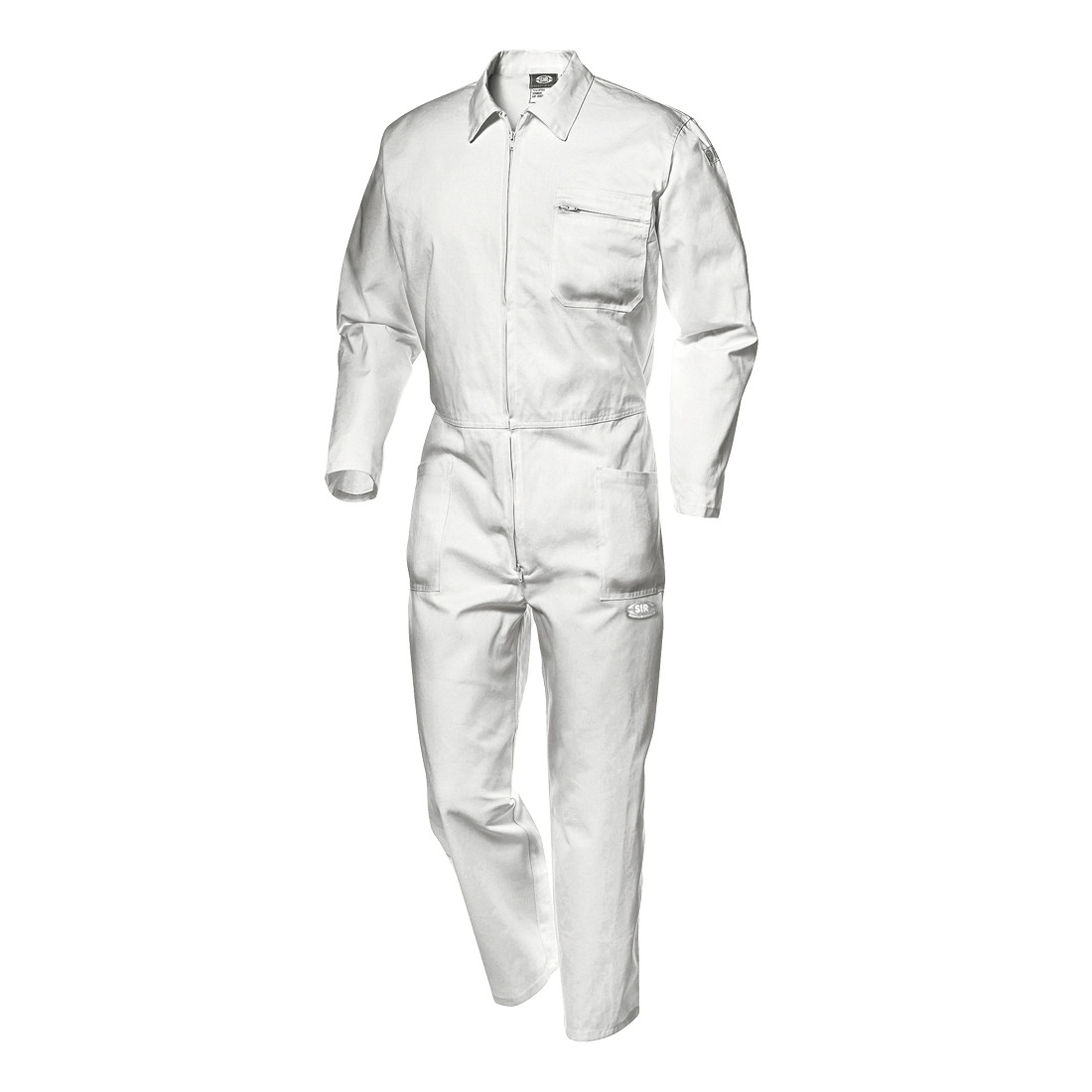 Coverall made of 100% Massaua sanforized cotton, weight 260 g/m2. Shirt collar, two-way zipper closure, elastic waistband, two side pockets, chest pocket with zipper closure and jointed double seams.