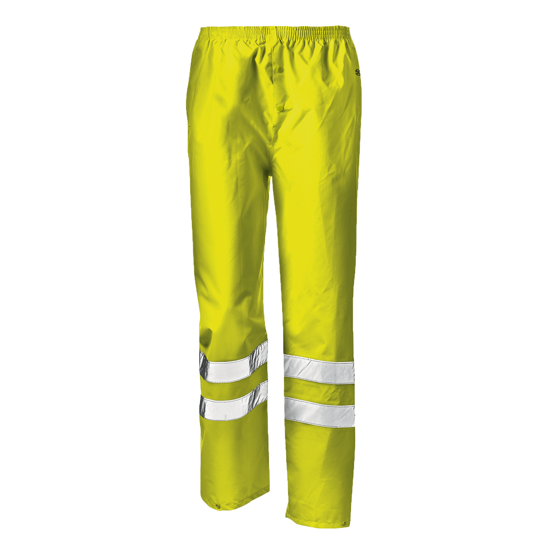 High visibility trousers in heat sealed fabric, with snap buttons closure, elastic waistband, exterior-to-interior access on the sides and ankle closures with snap buttons.