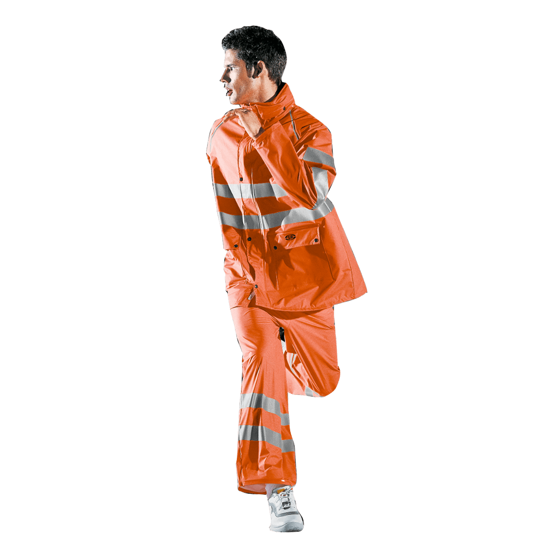High visibility jacket with concealed zipper closure and buttons, rollaway hood with elastic edge, elastic windproof cuffs, waterproof pockets with buttons closure and reflective piping on chest.