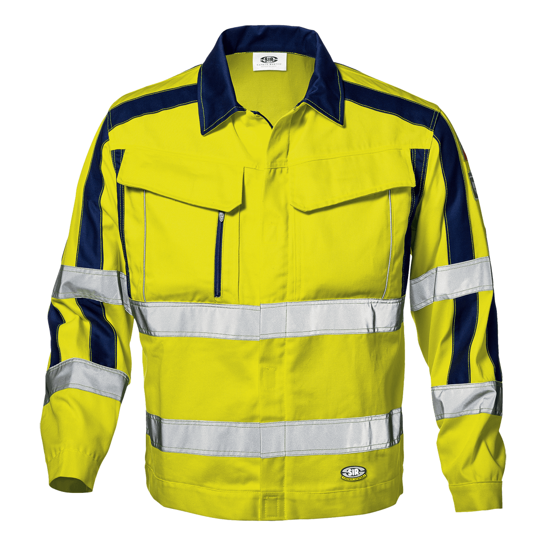 High visibility short jacket made of Super Fresh 100% cotton fabric, weight 305 g/m2, with shirt collar, concealed five button closure, one chest pockets and one tridimensional chest pocket with pen holder with flaps and Velcro. It features two loops of reflective bands around chest and sleeves.
