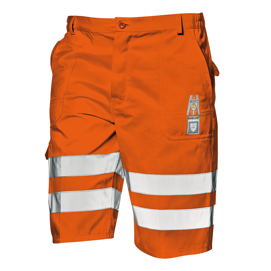 High visibility bermuda in Mistral fabric 55% cotton and 45% polyester, weight 240 g/m2. Fly with zip and button, elastic waistband on the sides, two front slanted pockets and two rear pockets with flaps and Velcro, right functional pocket with pen holder with flap and Velcro. Two loops of reflective bands around the legs.