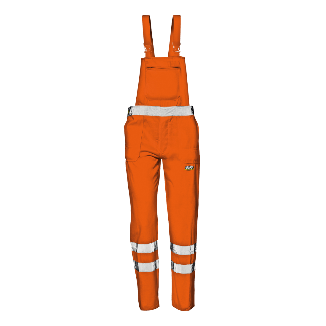 High visibility Bib-trousers made of fluorescent Mistral fabric 55% cotton and 45% polyester, weight 240 g/m2 with double stitched seams for high resistance. It features an elastic shoulder straps with quick-fastening buckle, concealed zipper patch pocket on the bib, waistband adjustable with buttons, rear-bib, right ruler pocket, two reinforced side pockets and one rear; jointed double stitching in the most vulnerable areas. One loop reflective band around the waist and two loops around the legs.
