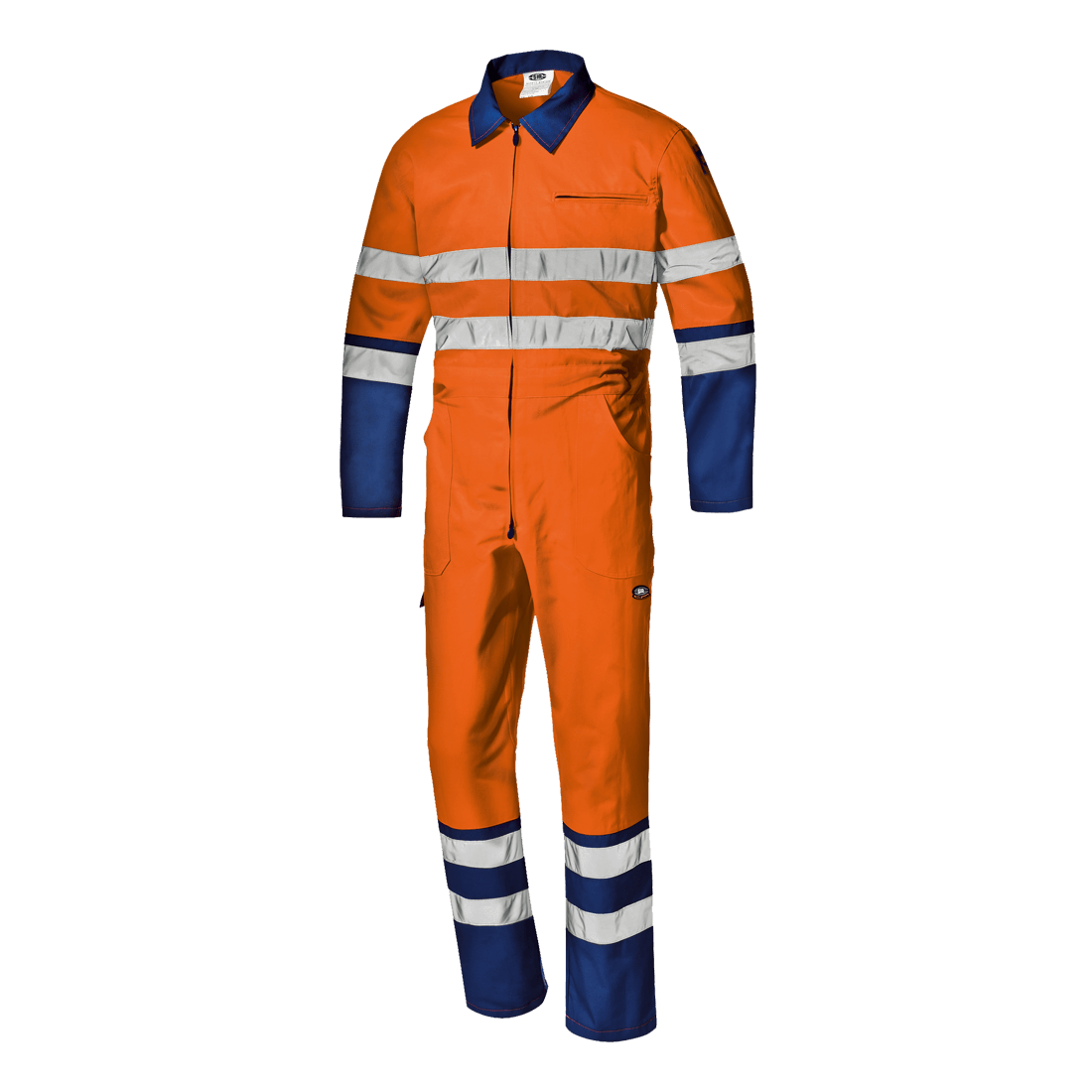 High visibility coverall made of fluorescent orange Mistral fabric 55% cotton and 45% polyester, weight 240 g/m2 and non fluorescent blue colour fabric. Body in high visibility fabric and collar, bottom part of sleeves and legs in blue; shirt collar, two-way concealed zipper closure, right ruler pocket, two side pockets, chest pocket with zipper closure, rear elastic waistband, jointed double stitching. Two loops of refletive band around chest, sleeves and legs.