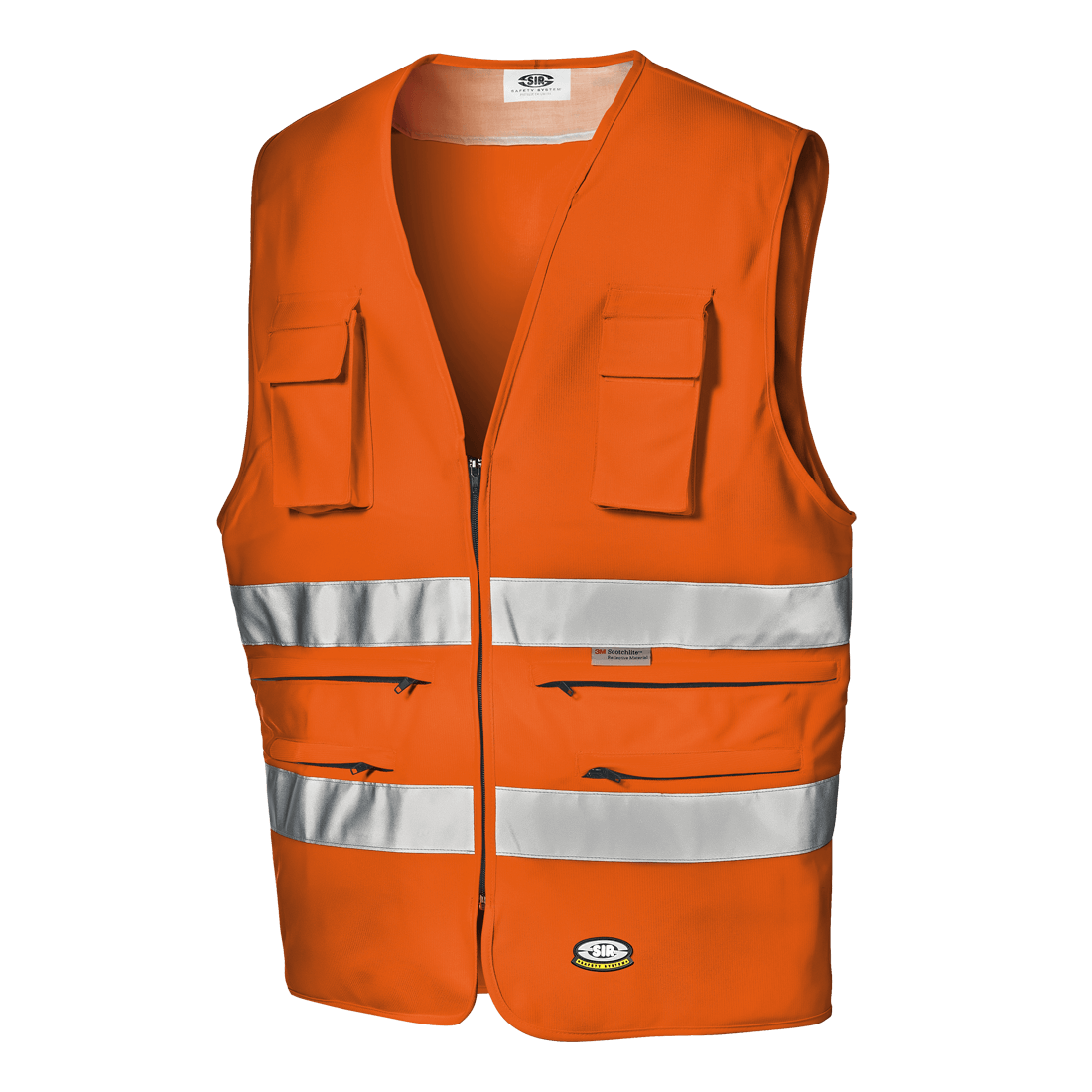 High visibility vest in 100% polyester, 170 g/m2. It features a shirt collar, zipper closure, tridimensional chest pockets with flaps and Velcro, four welt pockets with concealed zipper and two loops of reflective bands.