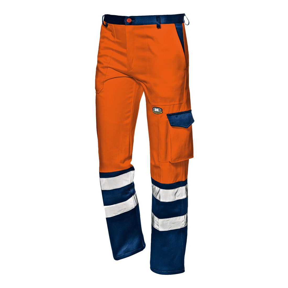 High visibility trousers made of fluorescent orange Velvet fustian fabric 60% cotton and 40% polyester, weight 350 g/m2, with zipper and button closure, two slanted side pockets, tridimensional functional pocket with flap and Velcro with left pen holder, ruler pocket on right leg, rear pocket with flap and button. Jointed double stitching in the most vulnerable areas. Top part in high visibility orange and bottom part of the legs, belt and pocket flaps in blue. Two loops of reflective bands around the legs.