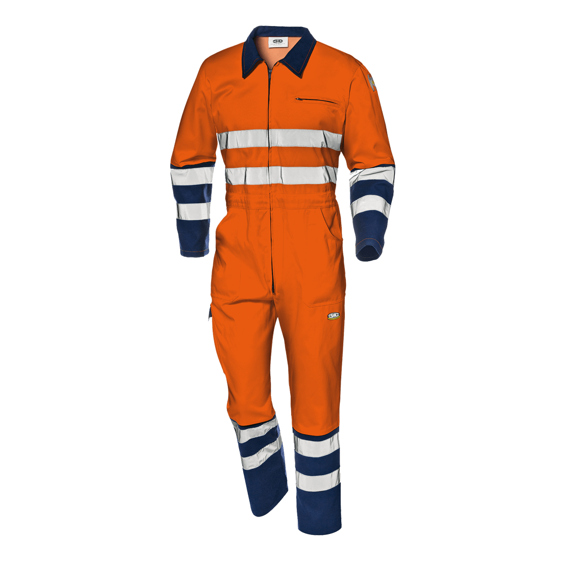 High visibility coverall made of fluorescent orange Velvet fustian fabric 60% cotton and 40% polyester, weight 350 g/m2, with shirt collar, concealed two-way zipper closure, right ruler pocket, two side pockets and one chest pocket with zipper, rear elastic waistband. Jointed double stitching. Collar and bottom part of sleeves and legs in high visibility orange and blue. Two loops of reflective bands around sleeves, chest and legs.