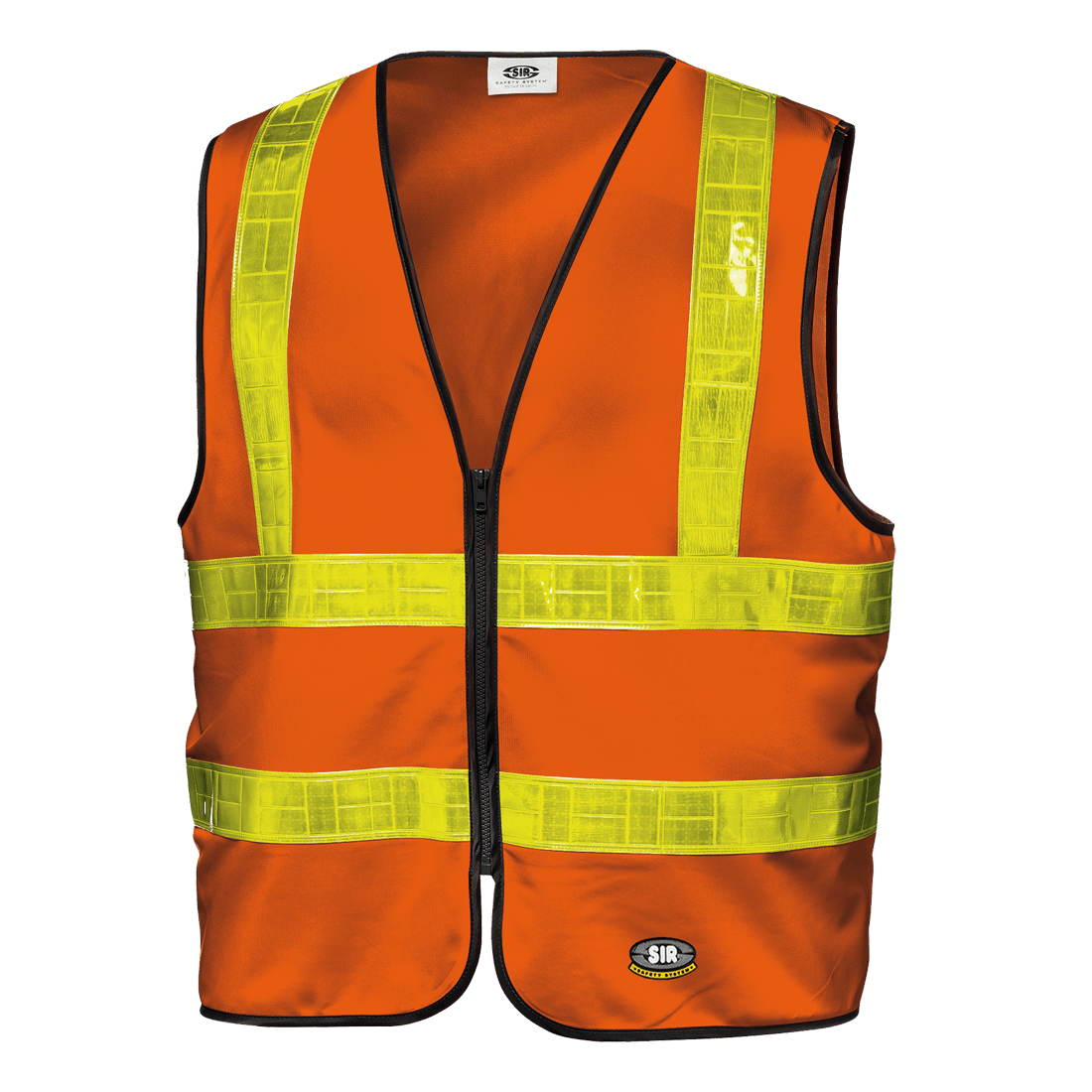 High visibility orange vest in 100% polyester, 170 g/m2, with zipper closure, two yellow prismatic water repellent bands around the chest and vertical band on the back.