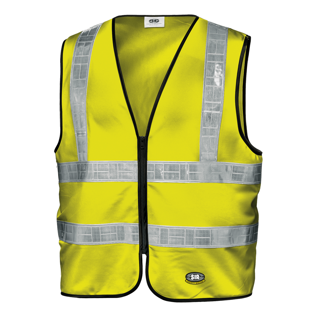 High visibility orange vest in 100% polyester, 170 g/m2, with zipper closure, two yellow prismatic water repellent bands around the chest and vertical band on the back.
