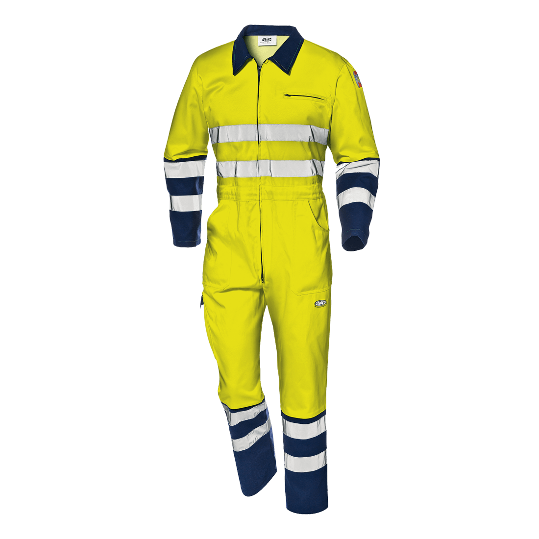 High visibility coverall made of fluorescent yellow Velvet fustian fabric 60% cotton and 40% polyester, weight 350 g/m2, with shirt collar, concealed two-way zipper closure, right ruler pocket, two side pockets and one chest pocket with zipper, rear elastic waistband. Jointed double stitching. Collar and bottom part of sleeves and legs in high visibility yellow and blue. Two loops of reflective bands around sleeves, chest and legs.