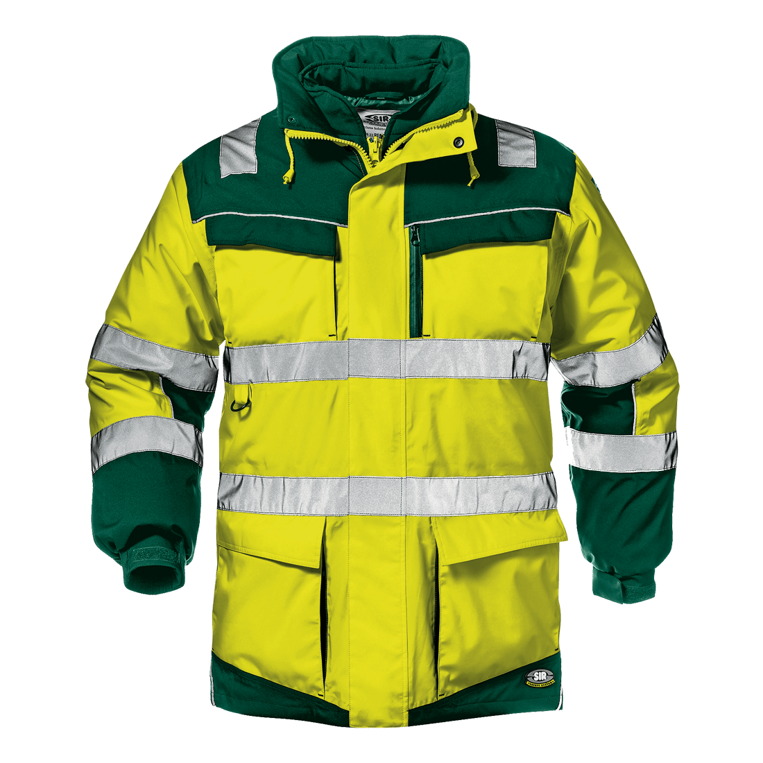 Four in one high visibility jacket in trilaminate 100% polyester Clipper-Tex fabric, padding 180 g/m2; breathable and waterproof. Front concealed two-way zipper closure with snap buttons, rollaway hood with drawstring, adjustable elastic cuffs with flaps and Velcro; water resistant side pockets and chest pockets, closed with flaps and Velcro, concealed badge holder, extra chest pocket with concealed water resistant zipper closure, side muff pockets, chest D-ring, two inner pockets. Reflective inserts and piping on the shoulders; double reflective band on chest and sleeves. Inner jacket with reflective bands and sleeves detachable by zipper, side pockets and inner pocket with zipper closure.