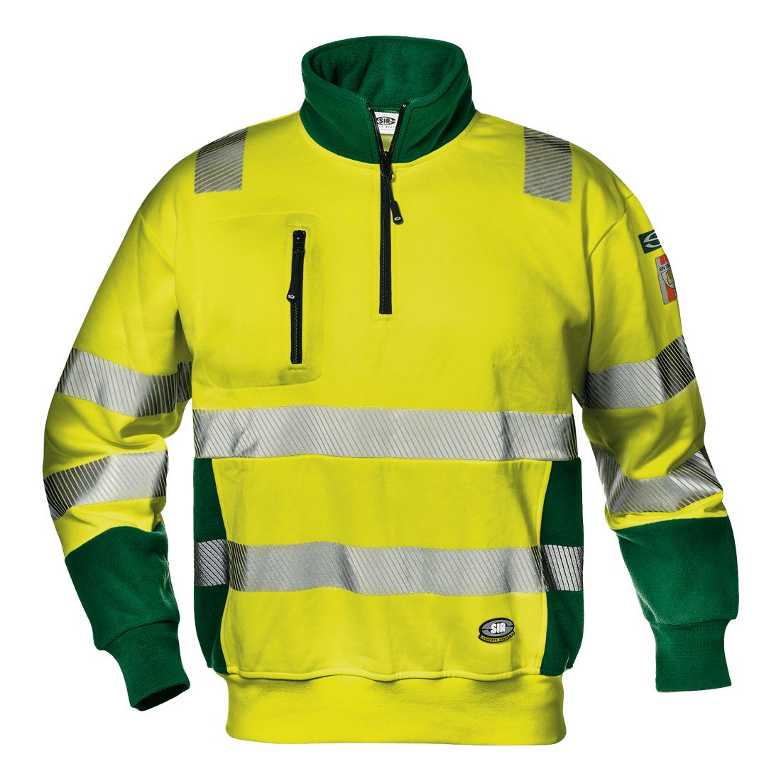 High visibility sweatshirt in 55% cotton and 45% polyester plush fabric, weight 320 g/m2. High collar with zipper closure, elastic knit cuffs and waistband, chest pocket with zipper closure.