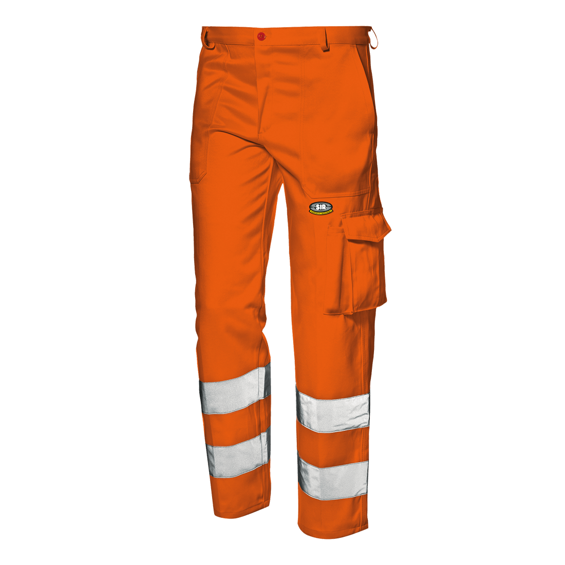 High visibility trousers made of fluorescent Velvet fustian fabric 60% cotton and 40% polyester, weight 350 g/m2, with zipper and button closure, two side welt pockets, left tridimensional functional pocket with flap and Velcro, pen holder, right ruler pocket, rear pocket with flap and button; jointed double stitching. It features two loops of reflective bands around the legs.