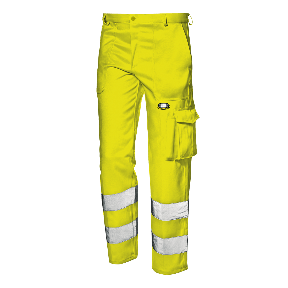 High visibility trousers made of fluorescent Velvet fustian fabric 60% cotton and 40% polyester, weight 350 g/m2, with zipper and button closure, two side welt pockets, left tridimensional functional pocket with flap and Velcro, pen holder, right ruler pocket, rear pocket with flap and button; jointed double stitching. It features two loops of reflective bands around the legs.