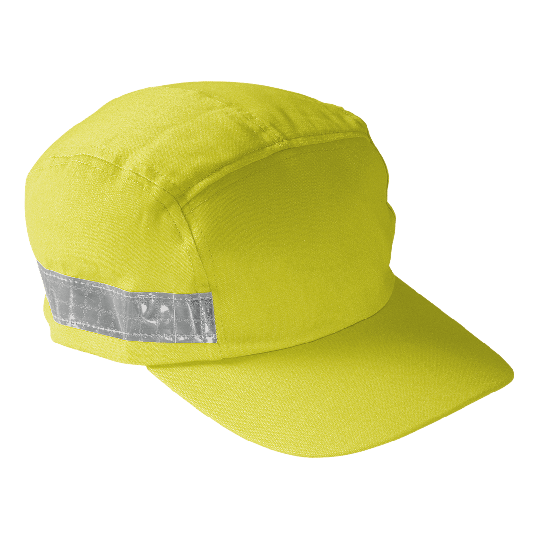 High visibility cap in 70% polyester and 30% cotton, with curved peak and reflective band, width adjustable with Velcro.