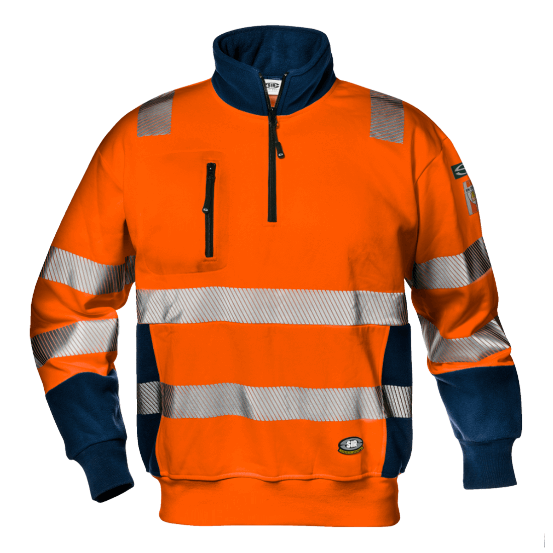 High visibility sweatshirt in 65% cotton and 35% polyester plush fabric, weight 320 g/m2. High collar with zipper closure, elastic knit cuffs and waistband, chest pocket with zipper closure.