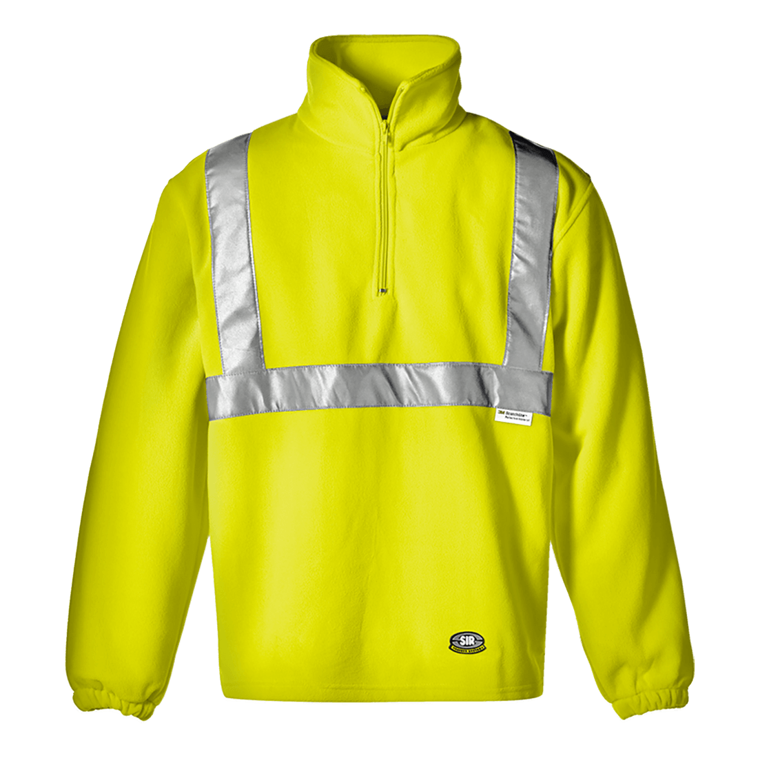 High visibility fleece in 100% polyester fleece, 320 g/m2, with turtleneck zipper closure and elastic cuffs. It features reflective band on chest and two bands on shoulders.