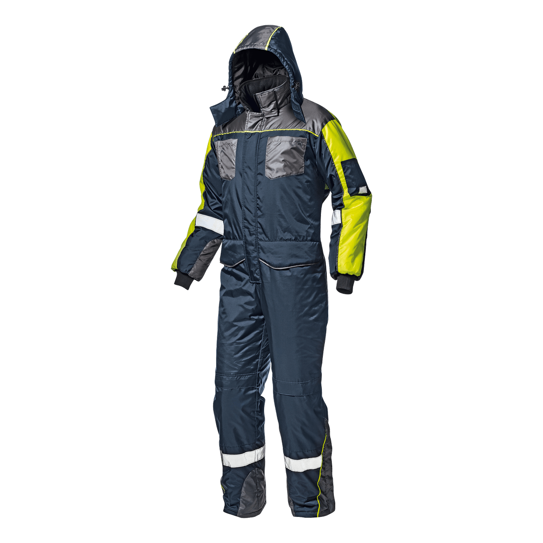 Coverall in 100% 420D Oxford nylon fabric with Thinsulate 3M padding 350 g/m2, suitable for protection against low temperatures down to -60°C. With concealed two-way zipper closure with buttons’ flap, chest pockets with Velcro and pen holder on the right. Pocket on left sleeve, frog closure on collar with double Velcro, side pockets with flaps and Velcro, collar with fleece lining, elastic knitted cuffs, inner pocket. Detachable padded hood with drawstring, small visor with double Velcro, knee pad pockets with Velcro closure and ankle zipper closure.