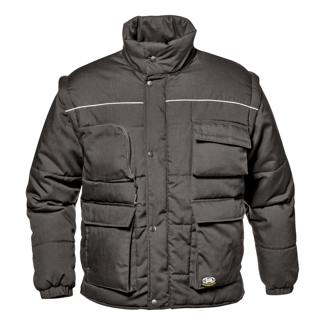Blouson in 65% polyester and 35% cotton light fabric, 160 g/m2 padding; concealed zipper and metal snap button closure, detachable sleeves with zipper. One chest pocket with flap and one chest pouch pocket with zipper closure, tridimensional side pockets with flaps and Velcro, inner pocket, elastic cuffs. Reflective piping on chest.