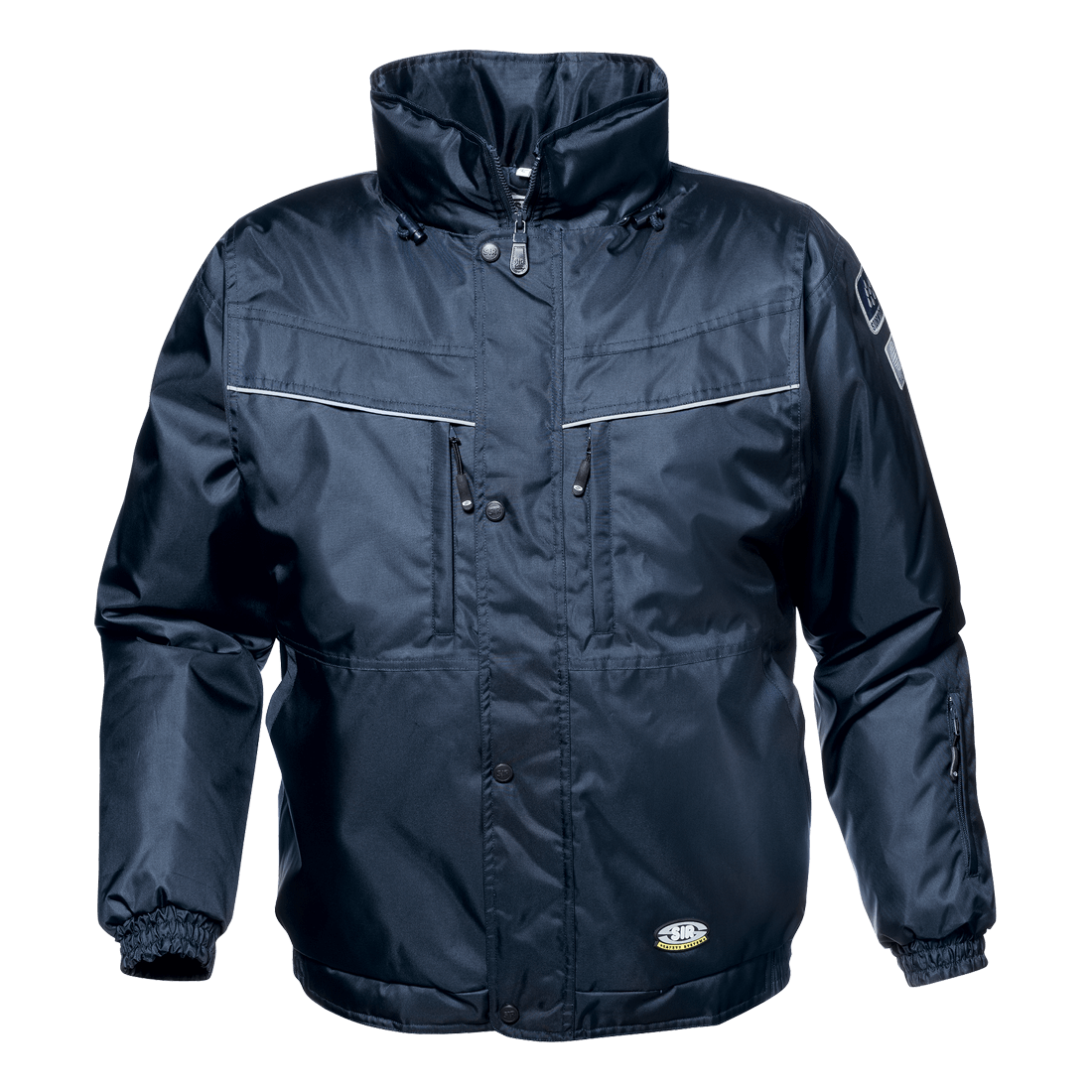 Blouson with outer layer in C-Tex, waterproof and breathable, 220 g/m2 padding. Concealed zipper and button closure, foldaway hood, chest pockets with zipper closure, innovative multipurpose phone pocket with zipper closure on left forearm, inner billfold pocket with Velcro. Muff pockets, elastic cuffs and waistband. Reflective piping on chest.