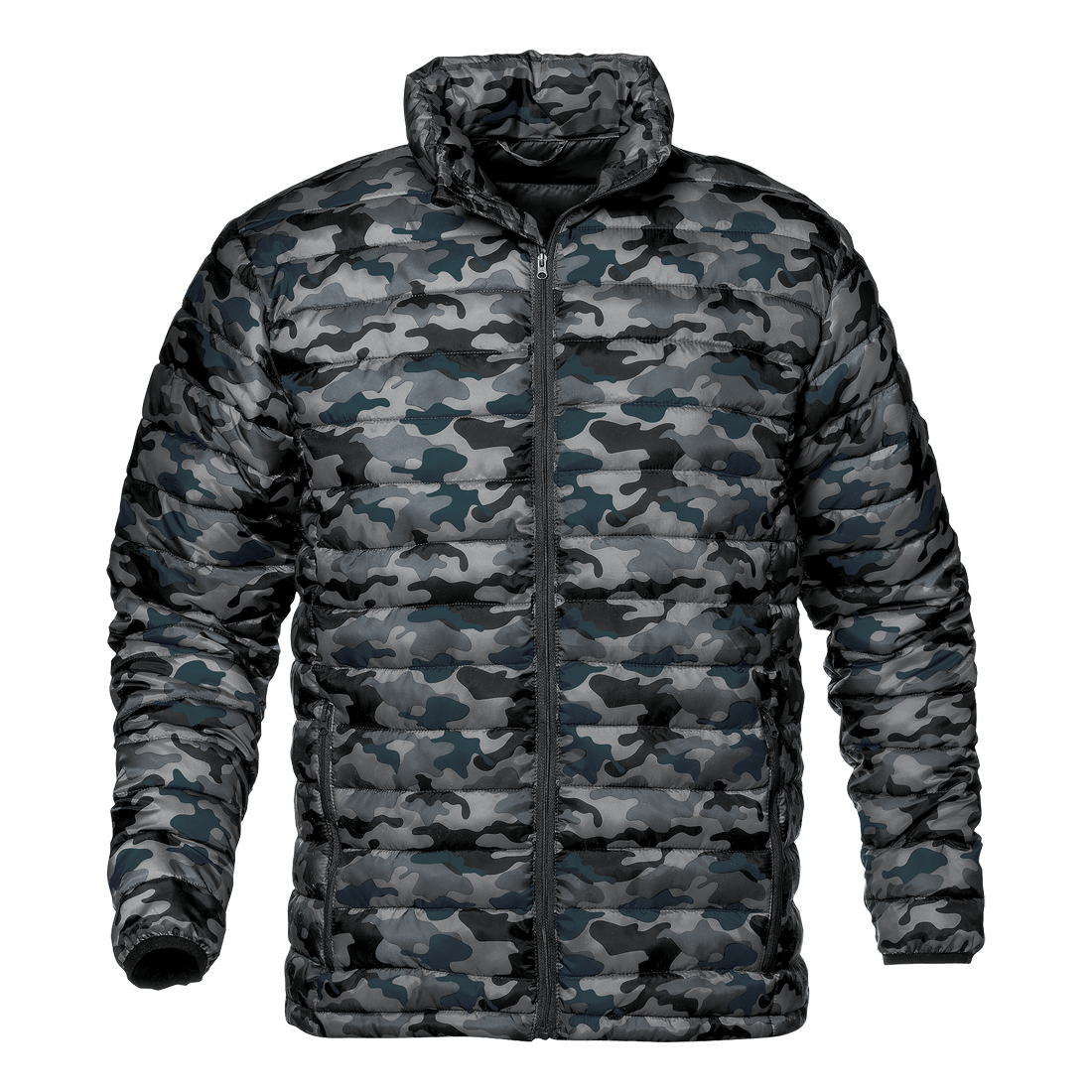 Down jacket in 100% camouflage printed nylon with 100% polyester lining and 100 g/m2 polyester padding with horizontal stitching, lightweight with high thermal properties. Zipper closure and inner windproof flap, side pockets with zipper closure, inner pockets, elastic cuffs, elastic drawstring waist, ergonomic model.