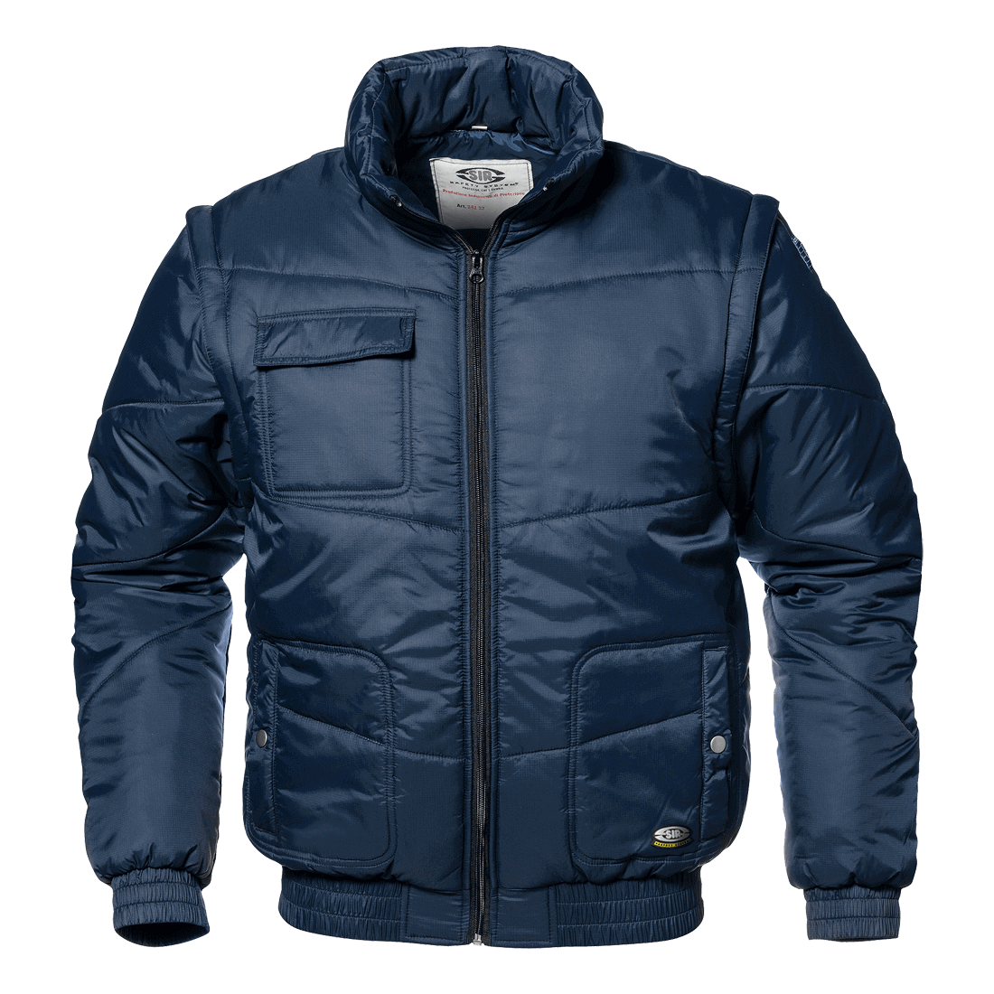 Jacket in 100% polyurethane coated nylon, 230 g/m2 padding. Drawstring adjustable foldaway hood and frog closure with Velcro, elastic on cuffs and waist, sleeves detachable by zip, right pocket with flap and Velcro, muff pockets with buttons, inner vertical pocket with zip and inner pocket with Velcro.