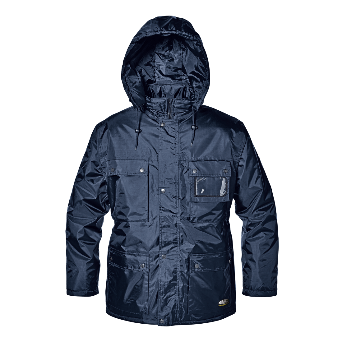 Jacket with outer layer in PVC- polyester fabric, waterproof with 150 g/m2 padding. Concealed zipper closure with snap buttons; tridimensional side pockets and chest pocket with button closure and waterproof flap, with foldable badge holder on the left and small vertical pocket with zipper closure on the right. Elastic windproof cuffs and inner pocket with Velcro.