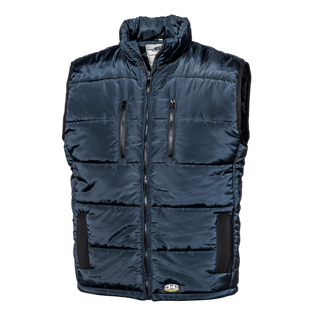 Bodywarmer in 100% PU coated nylon fabric, shiny and technological effect, 240 g/m2 padding. Zipper closure, muff pockets with knitted trim, vertical chest pockets with zipper closure, adjustment drawstring at the bottom; left inner pocket with Velcro, right inner pocket with zipper and phone pocket with cable retainer.