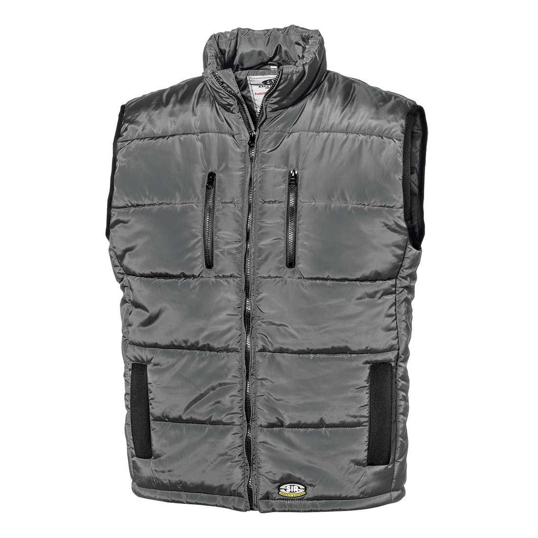 Bodywarmer in 100% PU coated nylon fabric, shiny and technological effect, 240 g/m2 padding. Zipper closure, muff pockets with knitted trim, vertical chest pockets with zipper closure, adjustment drawstring at the bottom; left inner pocket with Velcro, right inner pocket with zipper and phone pocket with cable retainer.