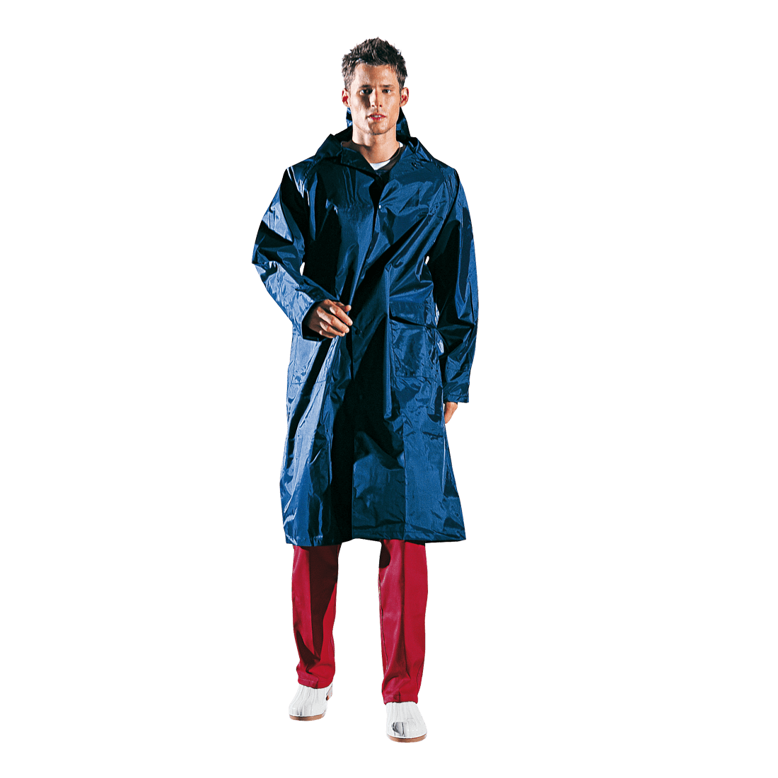 Knee-length raincoat in nylon/PVC fabric, with waterproof sealed seams. Front buttons closure and inner flap, foldaway hood with drawstring, elastic windproof cuffs, side waterproof pockets with flaps.