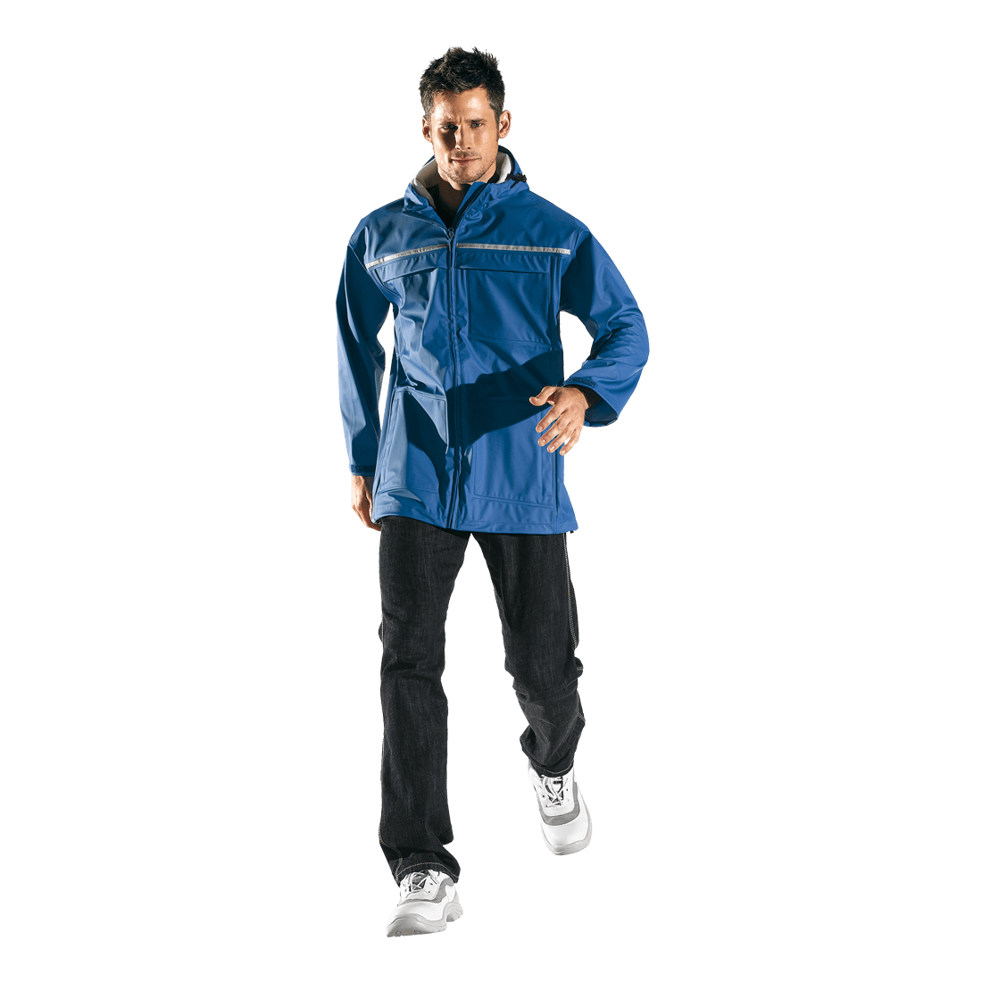 Jacket in Wonderflex fabric, waterproof, elastic and breathable. Concealed waterproof zipper closure, adjustable hood with drawstring, narrow reflective strip around chest and shoulders, Velcro adjustable cuffs; side pockets and chest pocket with zipper and water protective flap, inner phone pocket, adjustable bottom part with drawstring.