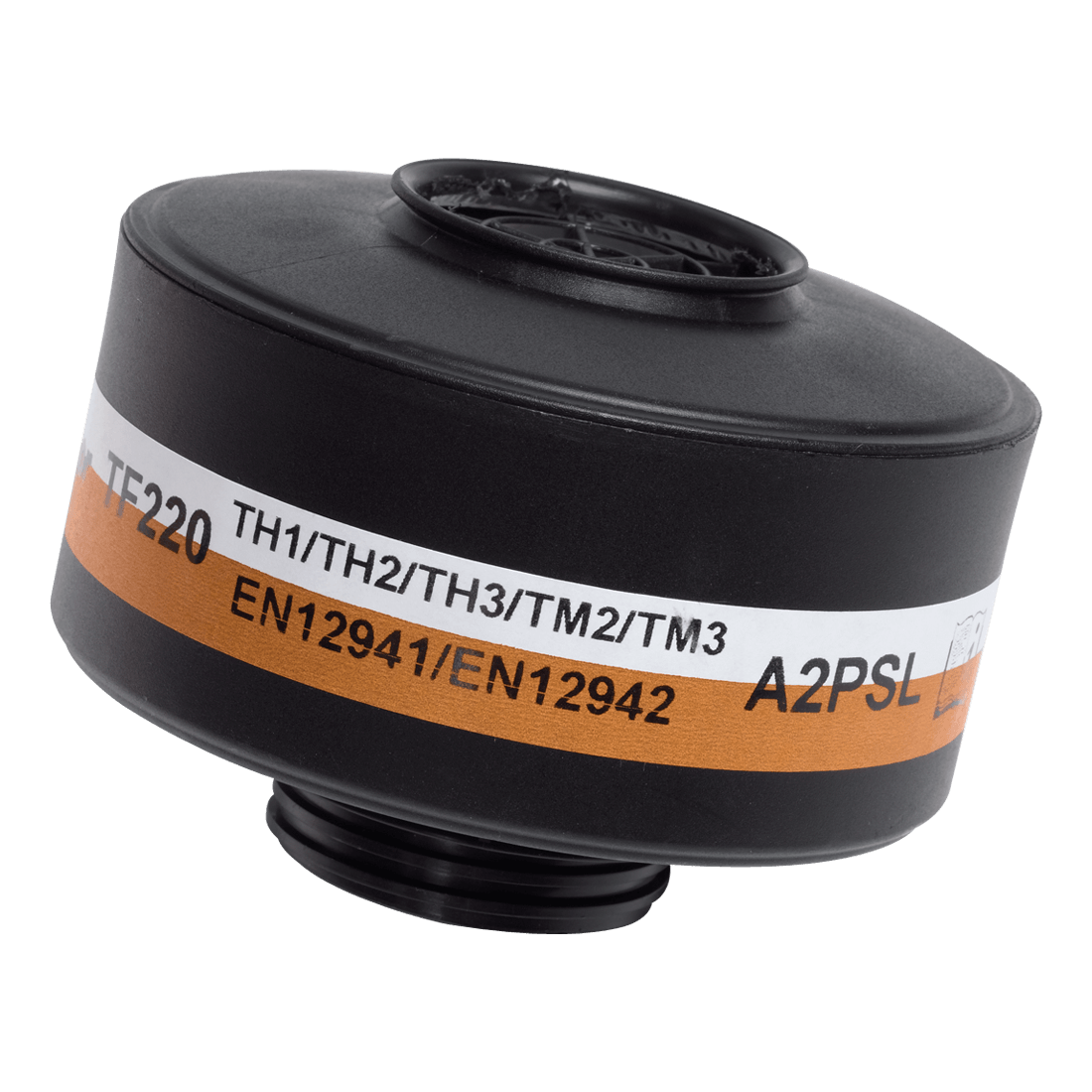 Tornado combined filter, type A2 PSL (P3). Organic gases and vapours with a boiling point above 65°C. Solid and liquid particulates (dusts, fibres, mists, fumes, bacteria and viruses).