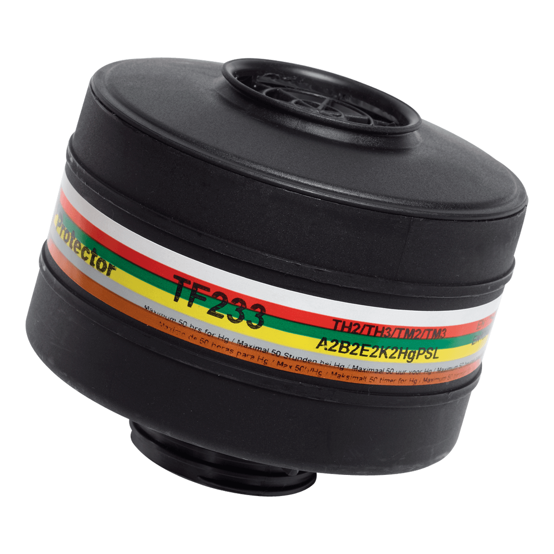 Tornado combined filter, type A2B2E2K2Hg-PSL(P3). Suitable for organic gases and vapours with a boiling point above 65°C. Inorganic and acid gases and vapours, e.g. chlorine, hydrogen sulphide, hydrogen cyanide, sulphur dioxide and hydrochloric acid, solid and liquid particulates (dusts, fibres, mists, fumes, bacteria and viruses), ammonia and organic ammonia derivatives, mercury Hg-PSL.